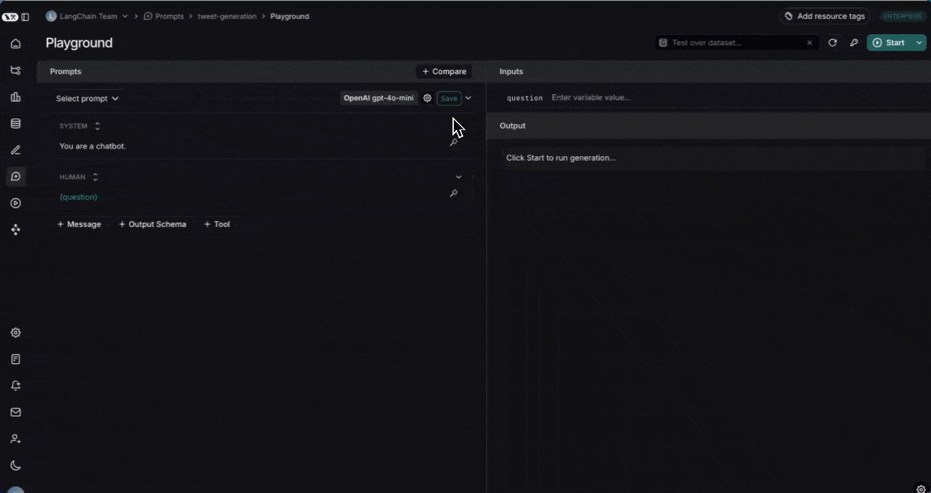 - Note that the keys in the dataset input must match the input variables of the prompt. For example, in the above video the selected dataset has inputs with the key “blog”, which correctly match the input variable of the prompt.